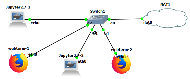 Добавьте в область топологии сети устройства NAT, Jupyter2.7, Webterm, Ethernet switch и подключите между собой сетевым кабелем согласно рисунку ниже: