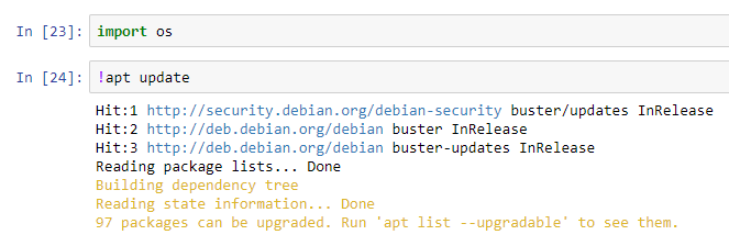 1. Jupyter может передавать команды в консоль прямо из графического веб интерфейса, для этого нужно использовать служебный символ «!» перед командой. Обновим список репозиториев выполнив команду !apt update