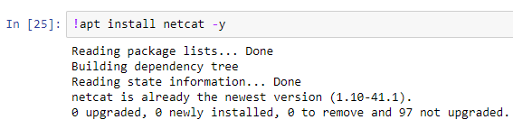 1. Установите пакет netcat выполнив команду !apt install netcat, обратите внимание, что если вывод команды соответствует изображению ниже, то утилита уже установлена