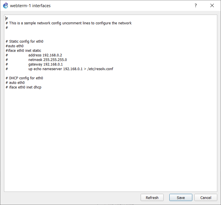 1. По умолчанию, в docker контейнерах отсутствует присвоение IP-адреса после старта устройства. Для возможности передачи данных через моделируемый сегмент сети необходимо включить технологию динамической конфигурации сетевых интерфейсов на устройствах Jupyter и Webterm (пункты аналогичны для обоих устройств)