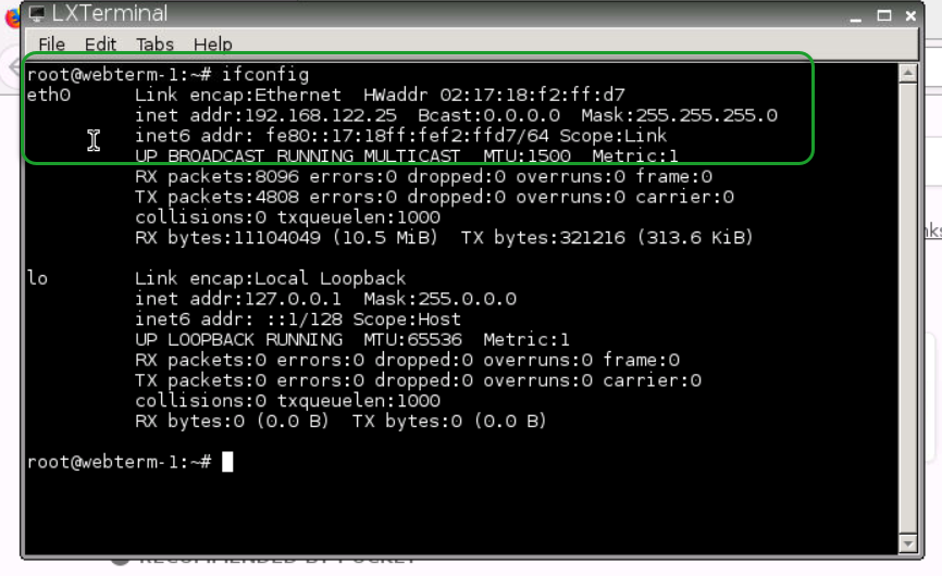 Убедитесь что ваши устройства получили IP-адреса. Для этого в webterm необходимо нажать кнопку, расположение которой совпадает с кнопкой Пуск в Windows, далее Terminal. В открывшемся окне выполните команду ifconfig. IP адрес должен быть указан в разделе eth0. Пример представлен ниже на рисунке.