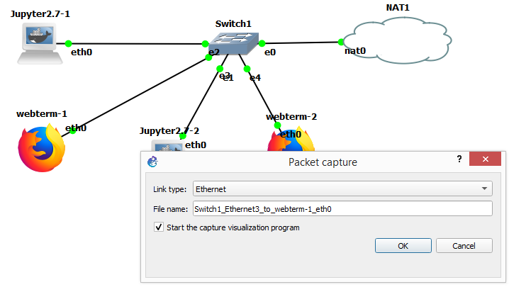 (Если таких устройств нет - установите их используя .gns3a файлы, доступно на сайте gns3. Пример: первая ссылка поиска по запросу "gns3 jupyter 2.7" приведет на сайт https://www.gns3.com/marketplace/appliances/webterm , где доступно скачивание этого файла, инструкция по установке также на этой странице)