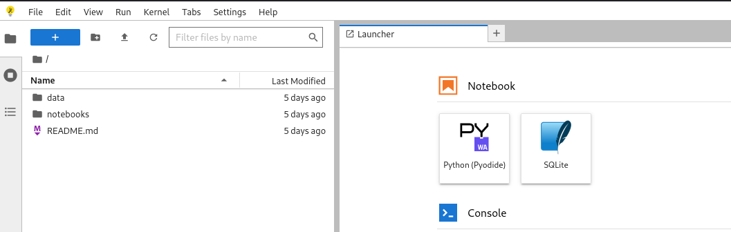 Для создания нового блокнота достаточно нажать на Python в секции Notebook. При этом в левой секции появится файл Untitled.ipynb.
